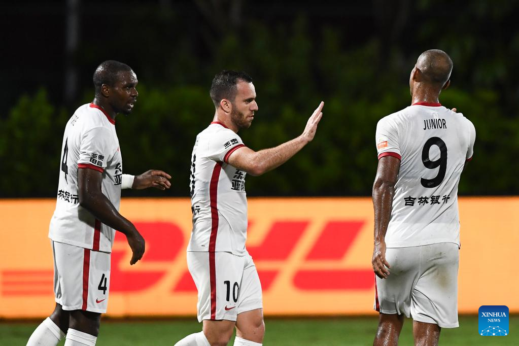 Junior (R) of Changchun Yatai celebrates scoring with teammates Serginho (C) and Okore during a 2022 season Chinese Football Association Super League (CSL) match between Hebei FC and Changchun Yatai in Haikou, south China's Hainan Province, Aug. 19, 2022. (Xinhua/Hu Zhixuan)
