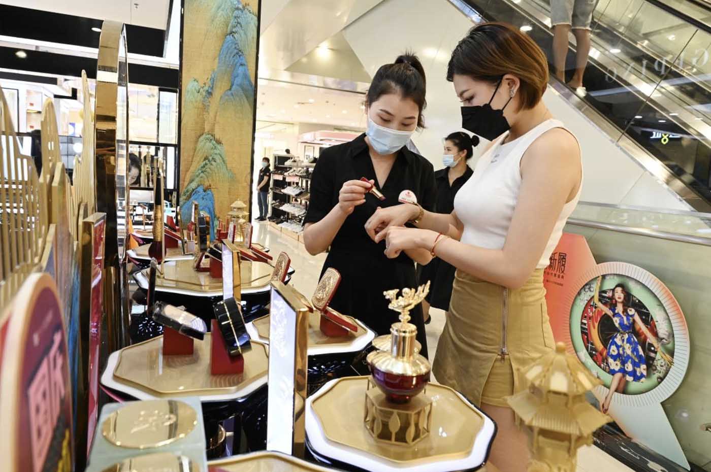 A woman buys beauty products inspired by cultural relics collected in the Palace Museum in a mall in Shapingba district, southwest China's Chongqing municipality, Oct. 4, 2021. (Photo by Sun Kaifang/People's Daily Online)