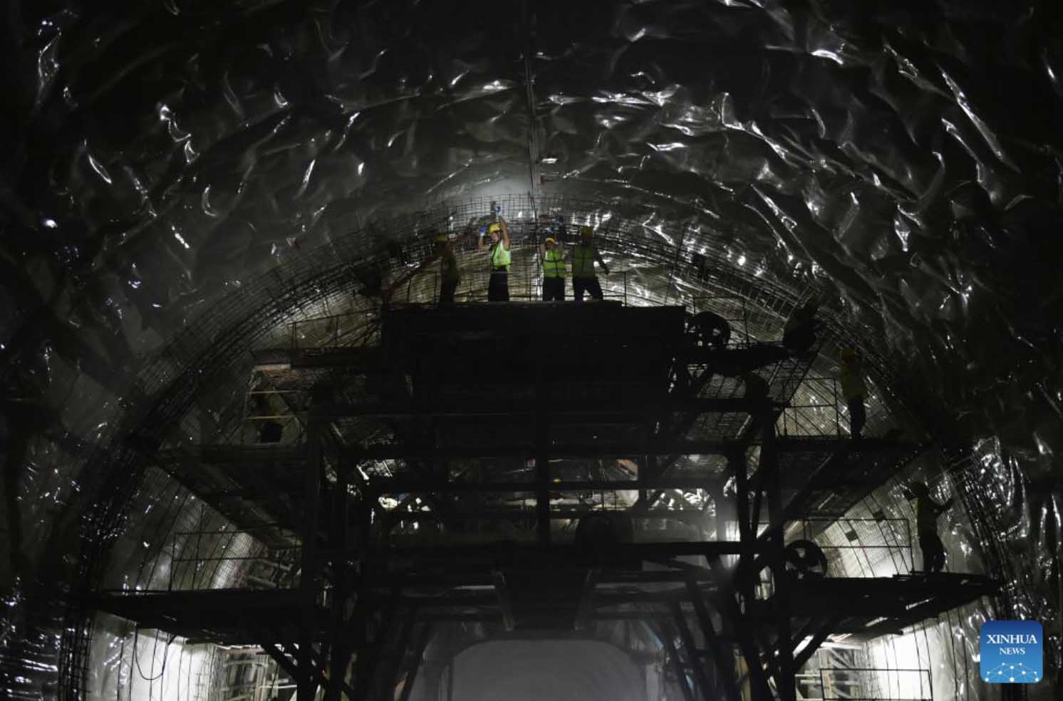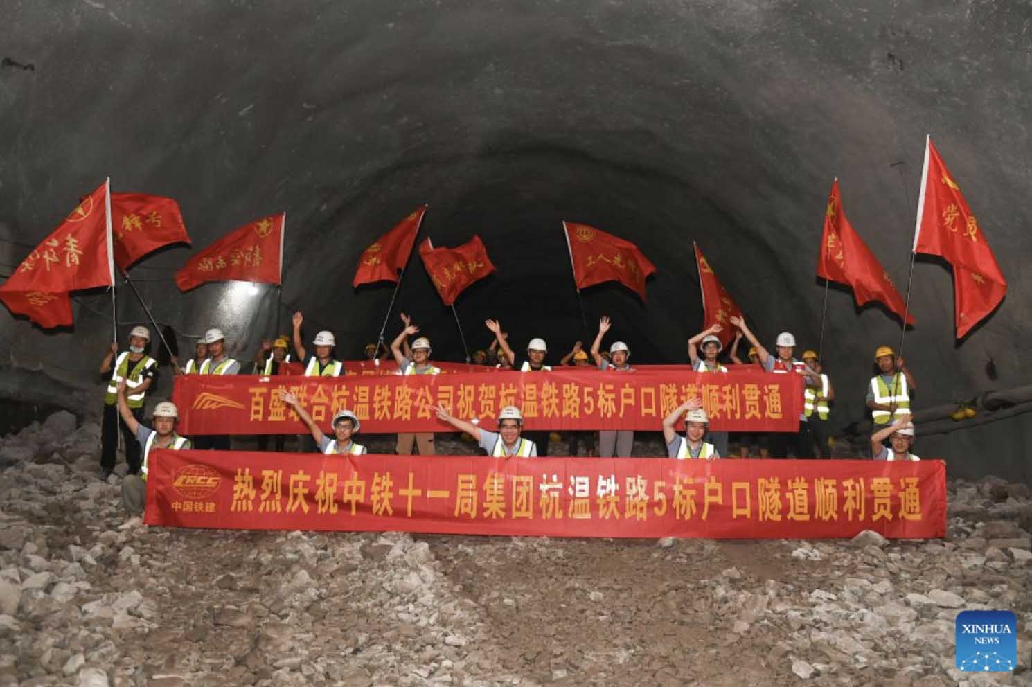 Constructors work at the Hukou tunnel of the Hangzhou-Wenzhou railway in east China's Zhejiang Province, Aug. 19, 2022. The Hukou tunnel of the high-speed railway linking Hangzhou and Wenzhou cities was drilled through on Friday. (Xinhua/Huang Zongzhi)