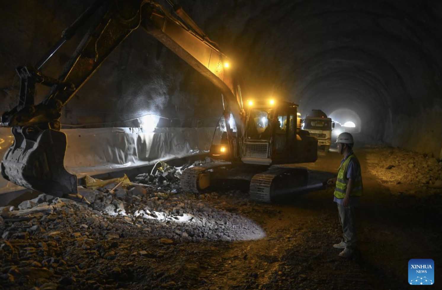 A constructor works at the Hukou tunnel of the Hangzhou-Wenzhou railway in east China's Zhejiang Province, Aug. 19, 2022. The Hukou tunnel of the high-speed railway linking Hangzhou and Wenzhou cities was drilled through on Friday. (Xinhua/Huang Zongzhi)