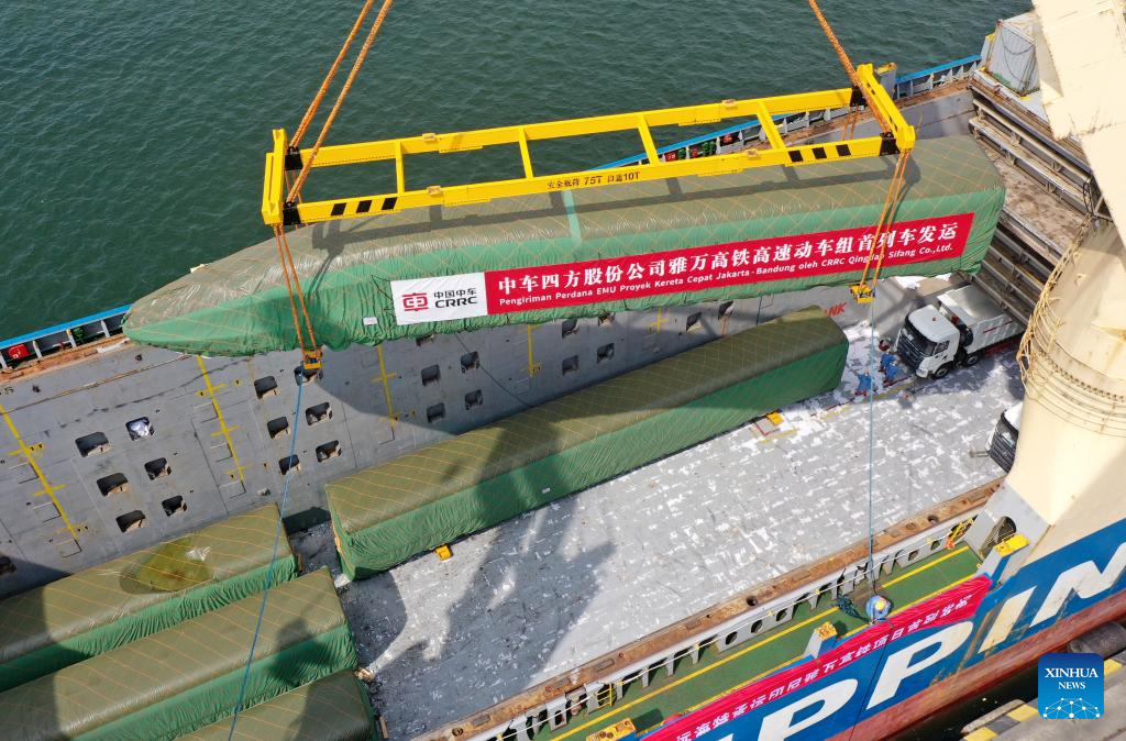QINGDAO, Aug. 21 (Xinhua) -- A high-speed electric passenger train and an inspection train, customized for the Jakarta-Bandung high-speed railway in Indonesia, left the port of Qingdao in east China's Shandong Province on Sunday.