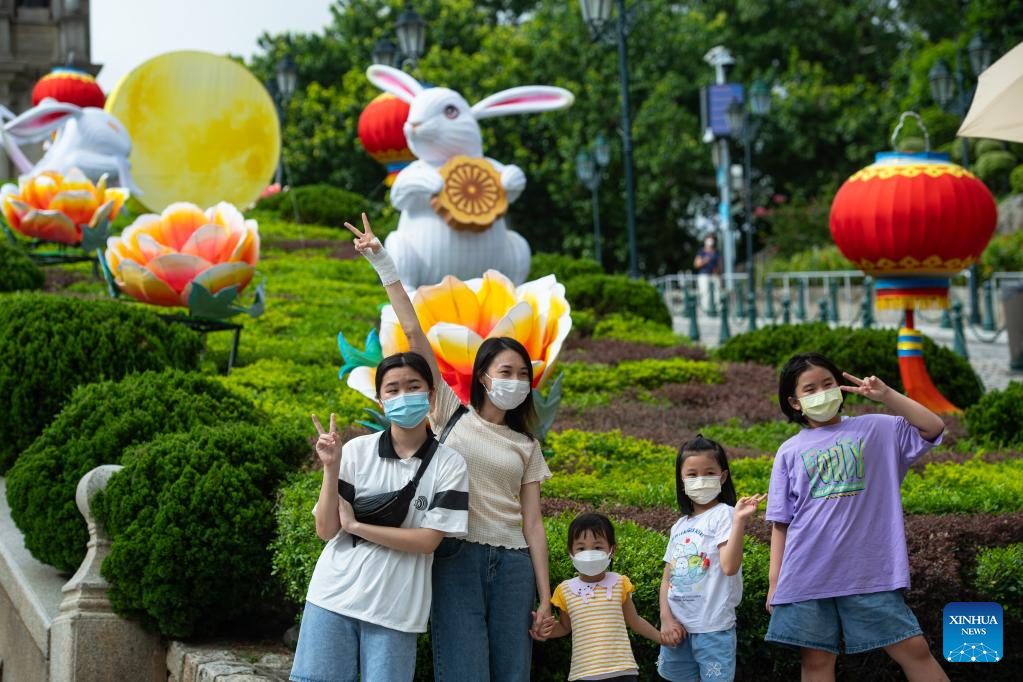Festive installations in celebration of the upcoming Mid-Autumn Festival are seen in front of the Ruins of the St. Paul's in Macao, south China, Aug. 21, 2022. (Xinhua/Cheong Kam Ka)