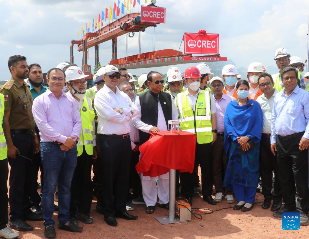 Bangladeshi Railways Minister Nurul Islam Sujan inaugurates the installation of rail track on the lower deck of Bangladesh's Padma Bridge on the outskirts of Dhaka, Bangladesh, Aug. 20, 2022. (Xinhua)