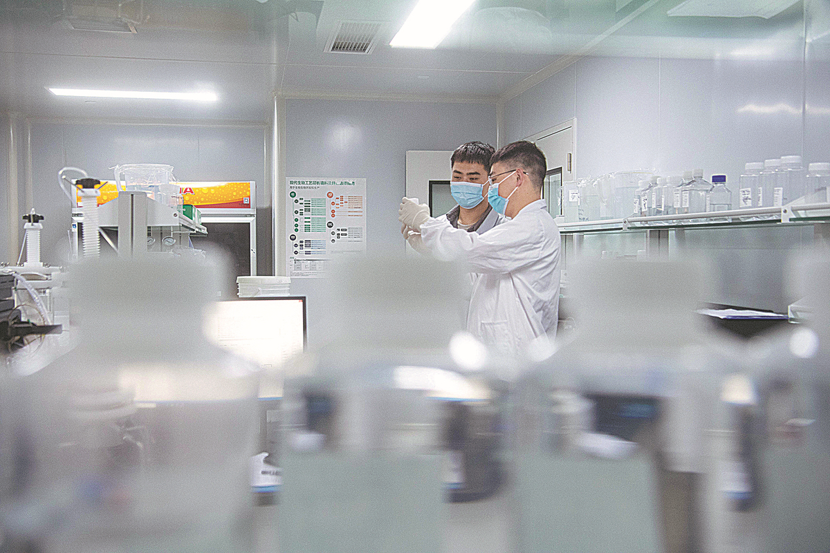 Technicians check diagnostic reagents at a biotech company's R&D center in Chongqing on March 29. China is expected to see an acceleration of tech progress over the next five years. [Photo/Xinhua]