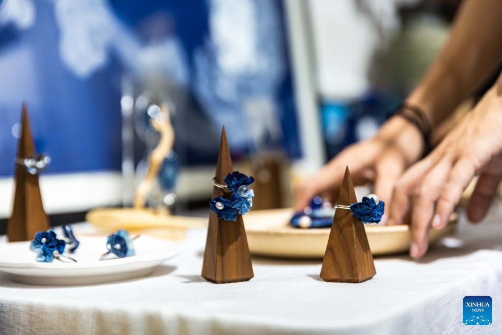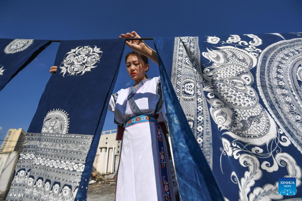 Zhang Juanjuan displays batik products at a batik studio in Anshun of southwest China's Guizhou Province, Aug. 18, 2022. Zhang Juanjuan, a girl of Miao ethnic group, decided to return home to take over her parents business related to batik products making after graduation. Batik is an intangible cultural heritage in her hometown. She registered her parents' batik workshop as a batik art company, and founded her own batik DIY studio. To expand her own business, Zhang Juanjuan and her colleagues have designed practical, environment-friendly, and fashionable batik products. Meanwhile, she has been teaching batik-making skills to other villagers, helping them increase their incomes through batik products. She hopes batik of the Miao ethnic group could be known by more people through internet and inherited by more young people. (Photo by Chen Xi/Xinhua)