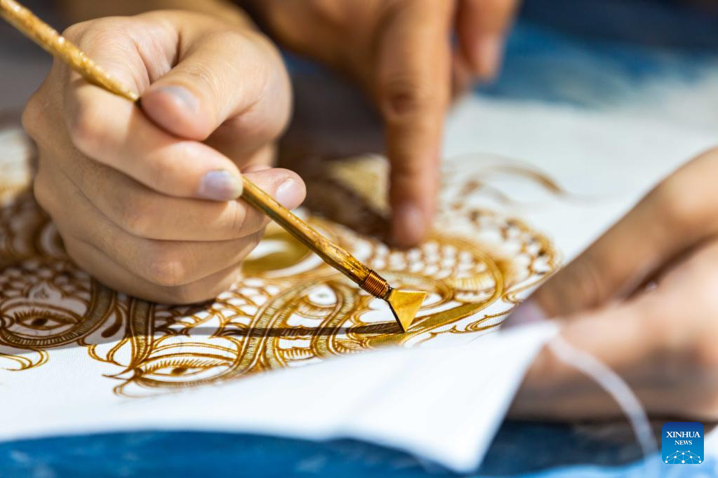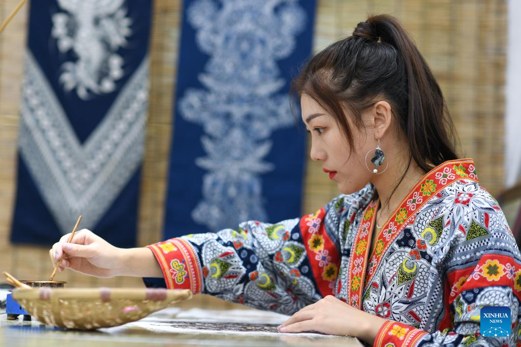 Zhang Juanjuan makes a batik painting at a batik DIY studio in Anshun of southwest China's Guizhou Province, Aug. 18, 2022. Zhang Juanjuan, a girl of Miao ethnic group, decided to return home to take over her parents business related to batik products making after graduation. Batik is an intangible cultural heritage in her hometown. She registered her parents' batik workshop as a batik art company, and founded her own batik DIY studio. To expand her own business, Zhang Juanjuan and her colleagues have designed practical, environment-friendly, and fashionable batik products. Meanwhile, she has been teaching batik-making skills to other villagers, helping them increase their incomes through batik products. She hopes batik of the Miao ethnic group could be known by more people through internet and inherited by more young people. (Xinhua/Yang Wenbin)
