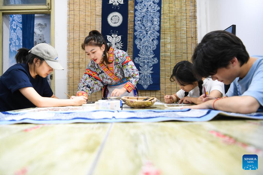 Zhang Juanjuan (2nd L) instructs her relatives and friends to make batik paintings at a batik DIY studio in Anshun of southwest China's Guizhou Province, Aug. 18, 2022. Zhang Juanjuan, a girl of Miao ethnic group, decided to return home to take over her parents business related to batik products making after graduation. Batik is an intangible cultural heritage in her hometown. She registered her parents' batik workshop as a batik art company, and founded her own batik DIY studio. To expand her own business, Zhang Juanjuan and her colleagues have designed practical, environment-friendly, and fashionable batik products. Meanwhile, she has been teaching batik-making skills to other villagers, helping them increase their incomes through batik products. She hopes batik of the Miao ethnic group could be known by more people through internet and inherited by more young people. (Xinhua/Yang Wenbin)