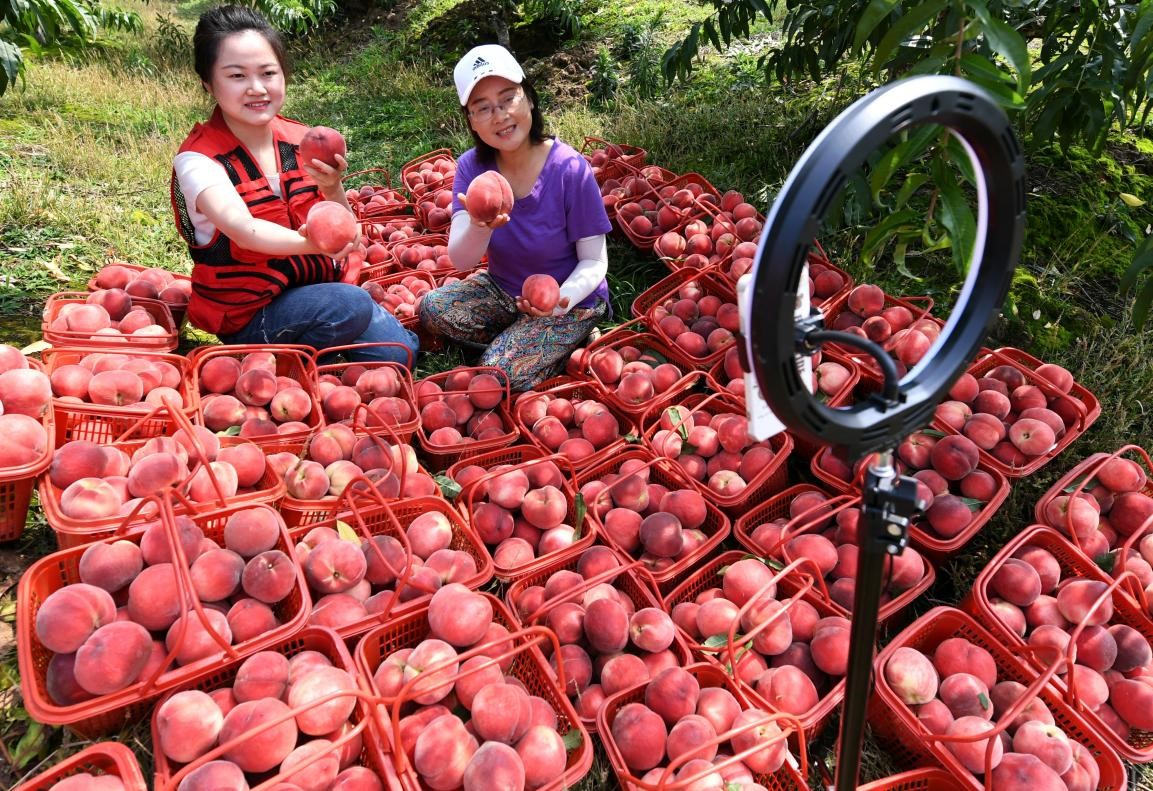 Volunteers from the publicity department of Daguan district, Anqing, east China's Anhui province help farmers sell peaches on a livestreaming platform, June 14, 2022. (People's Daily Online/Xiang Shunping)