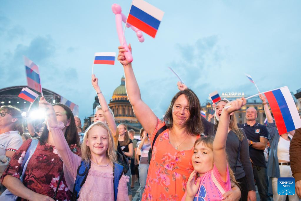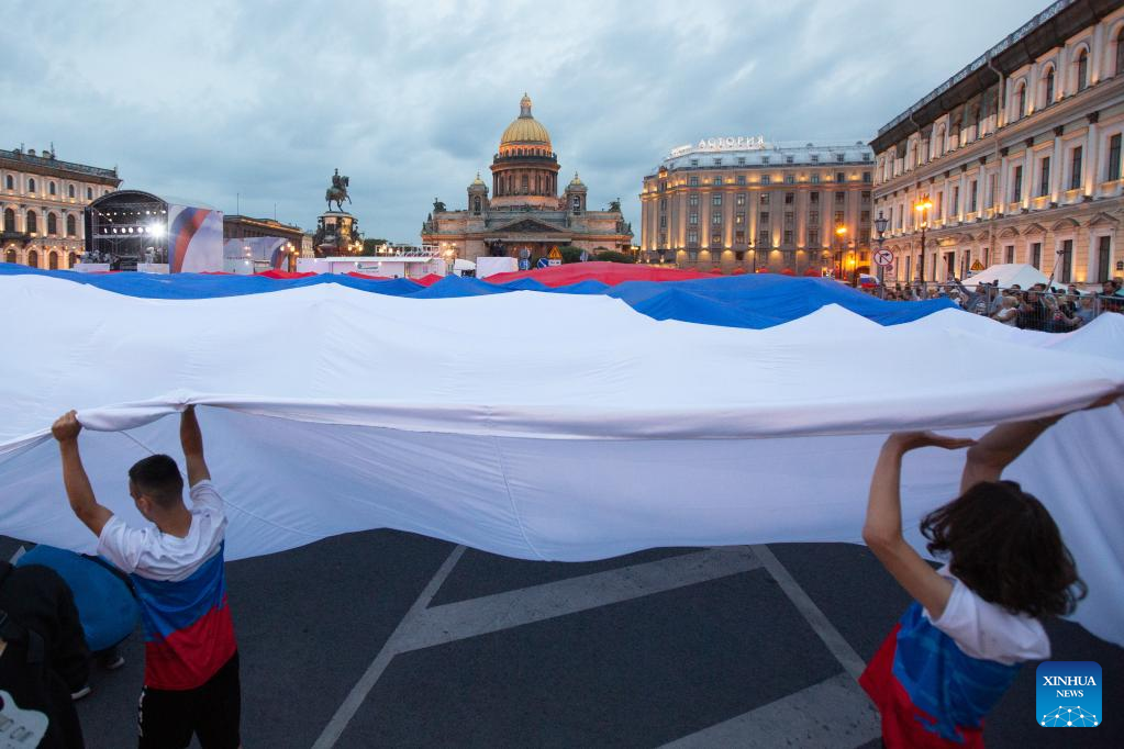 People participate in the National Flag Day celebrations in St. Petersburg, Russia, Aug. 22, 2022. (Photo by Irina Motina/Xinhua)