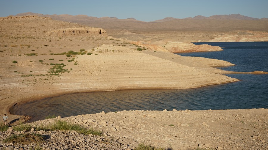Photo taken on July 5, 2022 shows a white band of dried rocks around Lake Mead near Echo Bay in Nevada, the United States. (Photo by Zeng Hui/Xinhua)