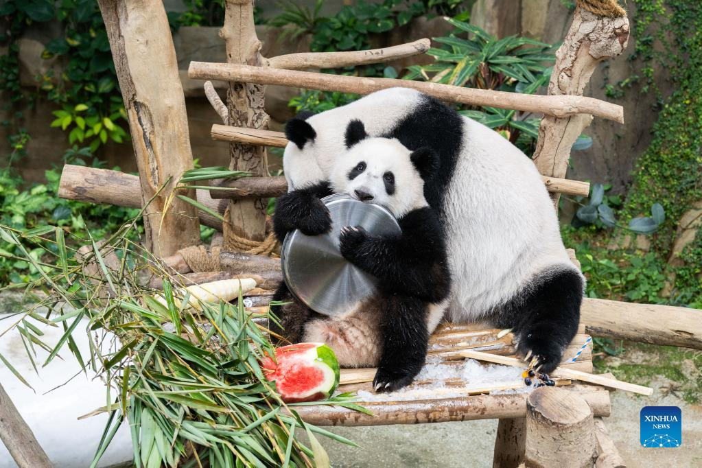 Giant panda Liang Liang (rear) and her baby Sheng Yi enjoy the birthday treats at Zoo Negara near Kuala Lumpur, Malaysia, Aug. 23, 2022. Giant pandas Xing Xing and Liang Liang celebrated their 16th birthday at Zoo Negara near Malaysia's capital Kuala Lumpur on Tuesday. Xing Xing and Liang Liang, arrived in Malaysia in 2014, have given birth to three giant panda cubs. (Xinhua/Zhu Wei)