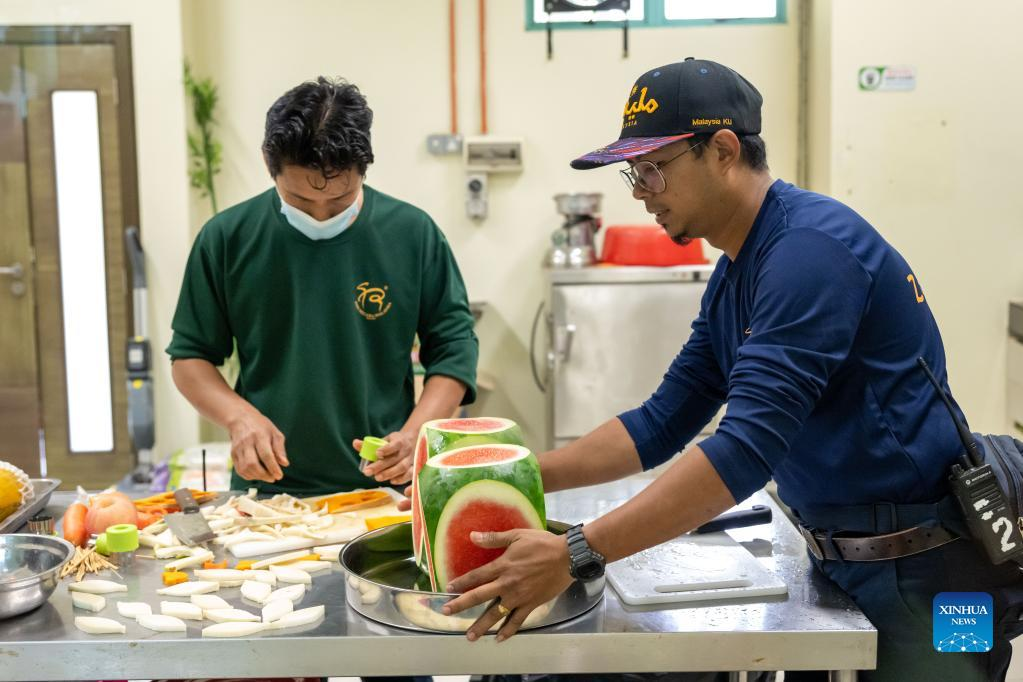 KUALA LUMPUR, Aug. 23 (Xinhua) -- Asper bamboo shoots are carefully measured, weighed and sliced. Apples, pears and carrots are cleaned and put aside while eggs, soybean, corn, rice and calcium powder are mixed together with corn oil to make "cakes".