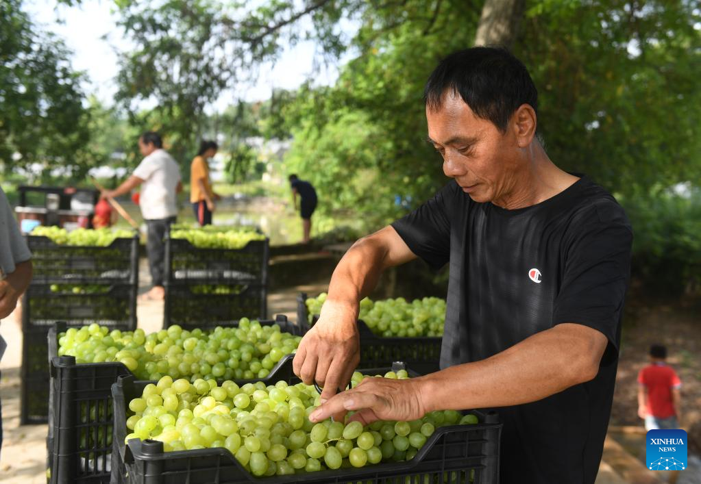 Villagers harvest grapes at a vineyard in Maozhushan Village of Caiwan Township in Quanzhou County, south China's Guangxi Zhuang Autonomous Region, Aug. 23, 2022. More than 2,000 mu (133 hectares) of grape fields entered the harvest season here recently. (Xinhua/Lu Boan)