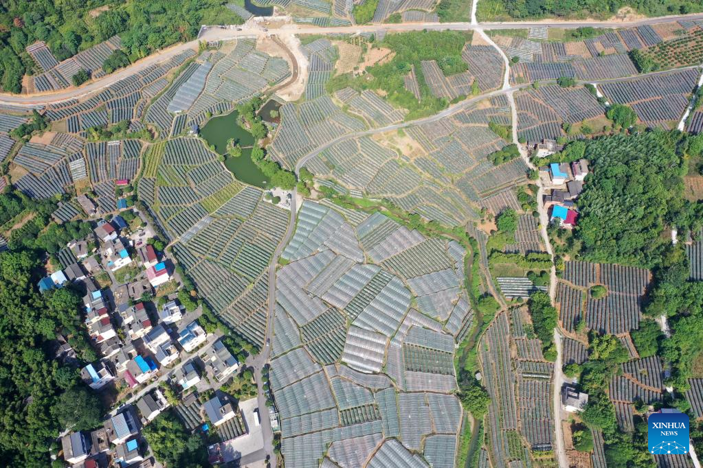 Aerial photo taken on Aug. 23, 2022 shows the vineyard in Maozhushan Village of Caiwan Township in Quanzhou County, south China's Guangxi Zhuang Autonomous Region. More than 2,000 mu (133 hectares) of grape fields entered the harvest season here recently. (Xinhua/Lu Boan)
