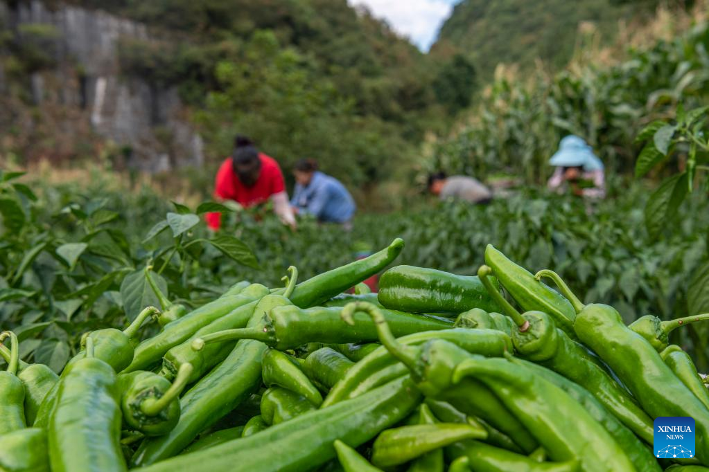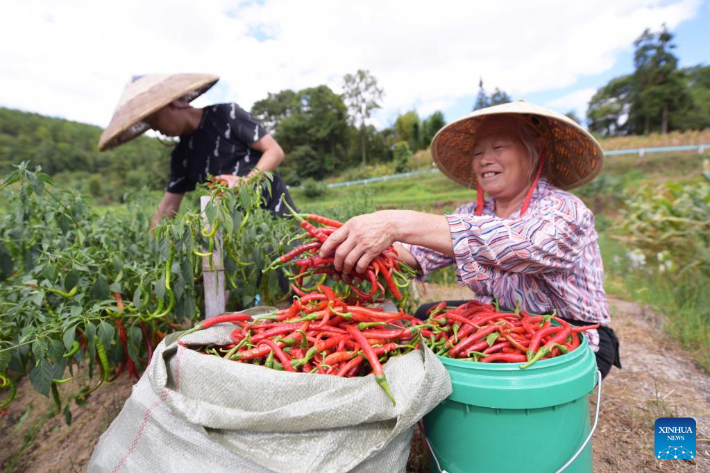 Villagers harvest chili peppers in Fengba Village of Cengong County, Qiandongnan Miao and Dong Autonomous Prefecture, southwest China's Guizhou Province, Aug. 22, 2022. Tuesday marks the Chushu of the solar terms. The scorching summer is going to pass by after this day. (Photo by Tang Peng/Xinhua)