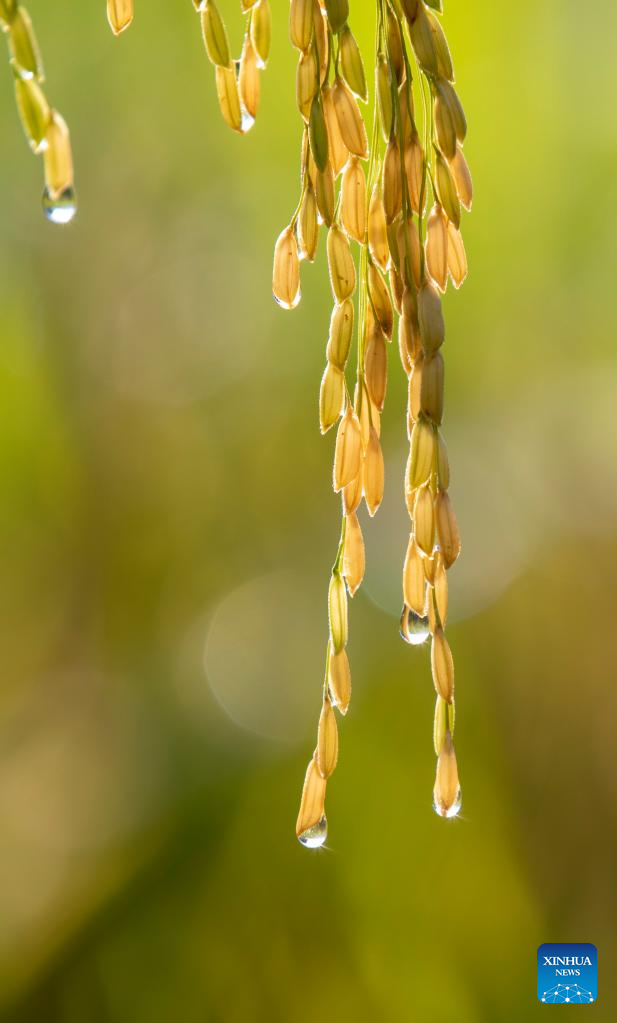 Photo taken on Aug. 17, 2022 shows the ripening grains reflected on a drop of dew on a rice leaf in Zhanliang Village of Danzhai County, Qiandongnan Miao and Dong Autonomous Prefecture, southwest China's Guizhou Province. Tuesday marks the Chushu of the solar terms. The scorching summer is going to pass by after this day. (Photo by Huang Xiaohai/Xinhua)