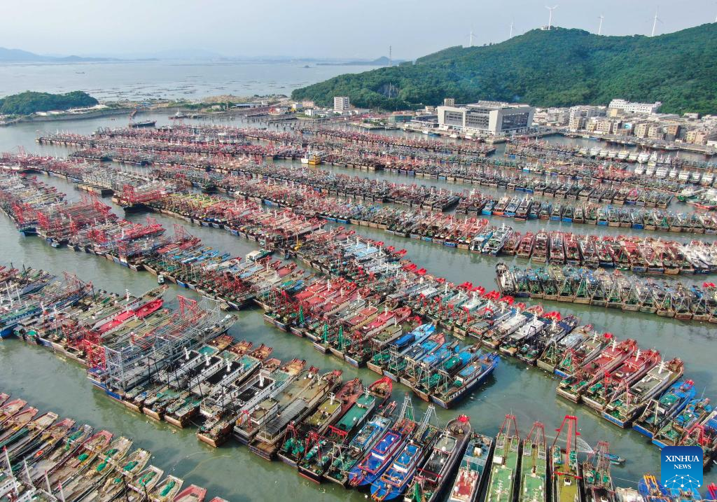 In this aerial photo, fishing boats have returned to a port for shelter in Yangjiang City, south China's Guangdong Province, Aug. 24, 2022.