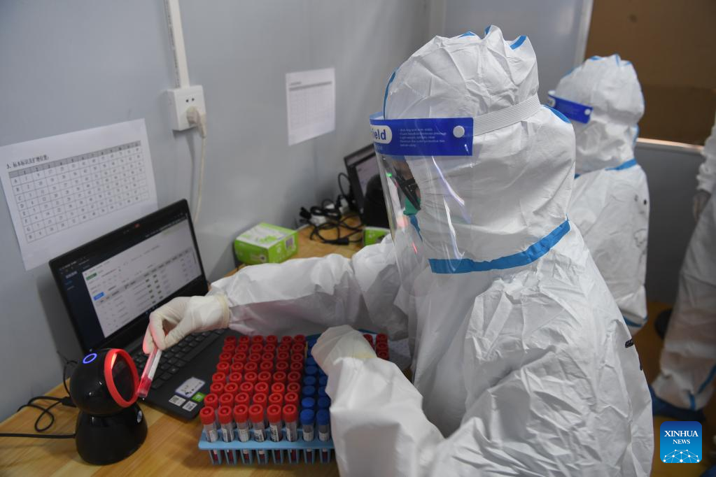 Medical workers scan the codes of nucleic acid samples at a testing lab in Sanya, south China's Hainan Province, Aug. 14, 2022. (Xinhua/Zhao Yingquan)