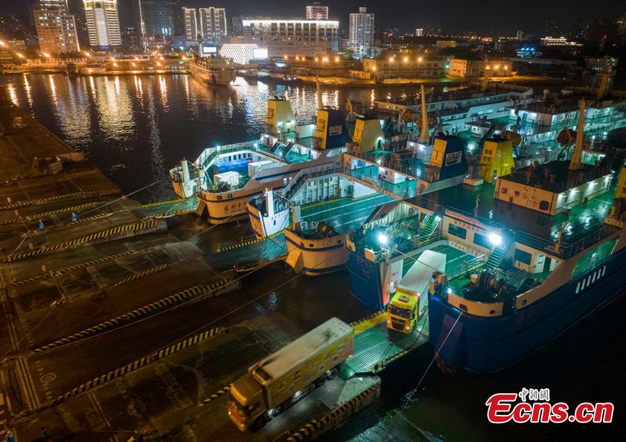 Drone photo shows ro-ro passenger ships anchor at a port in Haikou, capital of Hainan Province, Aug. 25, 2022, as Typhoon Ma-on is forecast to make landfall. (Photo: China News Service/Luo Yunfei)