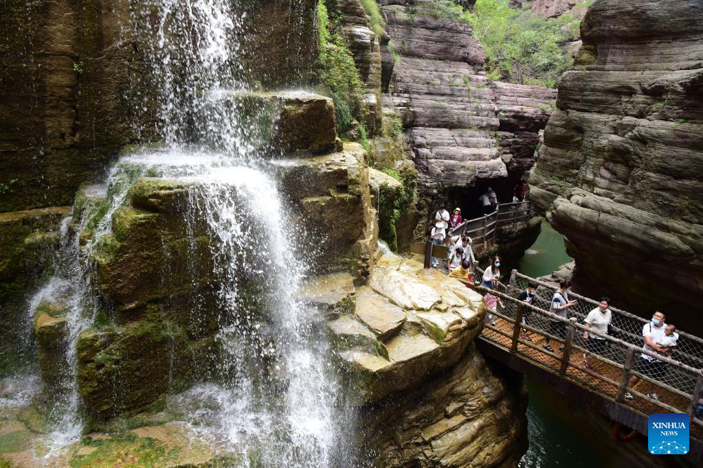 People visit the Yuntai Mountain scenic spot in central China's Henan Province, Aug. 24, 2022. (Xinhua/Lyu Guoqing)