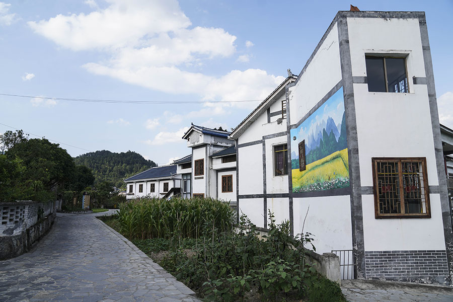 Photo taken on July 23, 2022, shows one of the houses with a mural painted on the wall in Huamao Village in Zunyi, southwest China’s Guizhou Province. (People’s Daily Online/Peng Yukai)