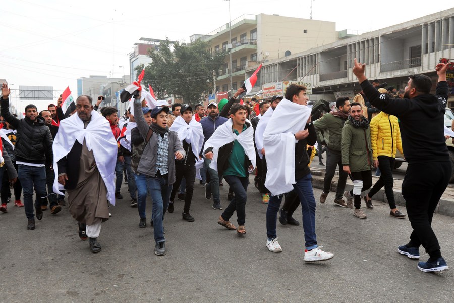 Iraqi protesters take part in a demonstration against the presence of U.S. troops in the country, in Baghdad, capital of Iraq, Jan. 24, 2020. (Xinhua/Khalil Dawood)