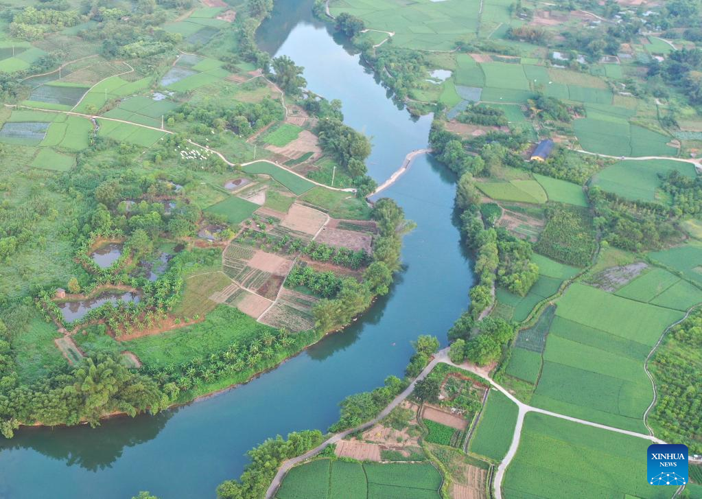 Aerial photo taken on Aug. 24, 2022 shows the scenery along Yulong River in Yangshuo County, Guilin City, south China's Guangxi Zhuang Autonomous Region. (Xinhua/Zhou Hua)