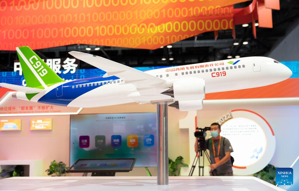 A model of C919 passenger aircraft is seen during a media preview of the 2022 China International Fair for Trade in Services (CIFTIS) at the China National Convention Center in Beijing, capital of China, Aug. 28, 2022. The 2022 CIFTIS will be held at the China National Convention Center and the Shougang Park in Beijing from Aug. 31 to Sept. 5. (Xinhua/Cai Yang)