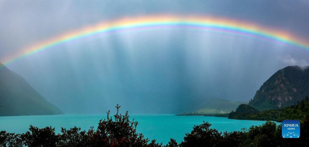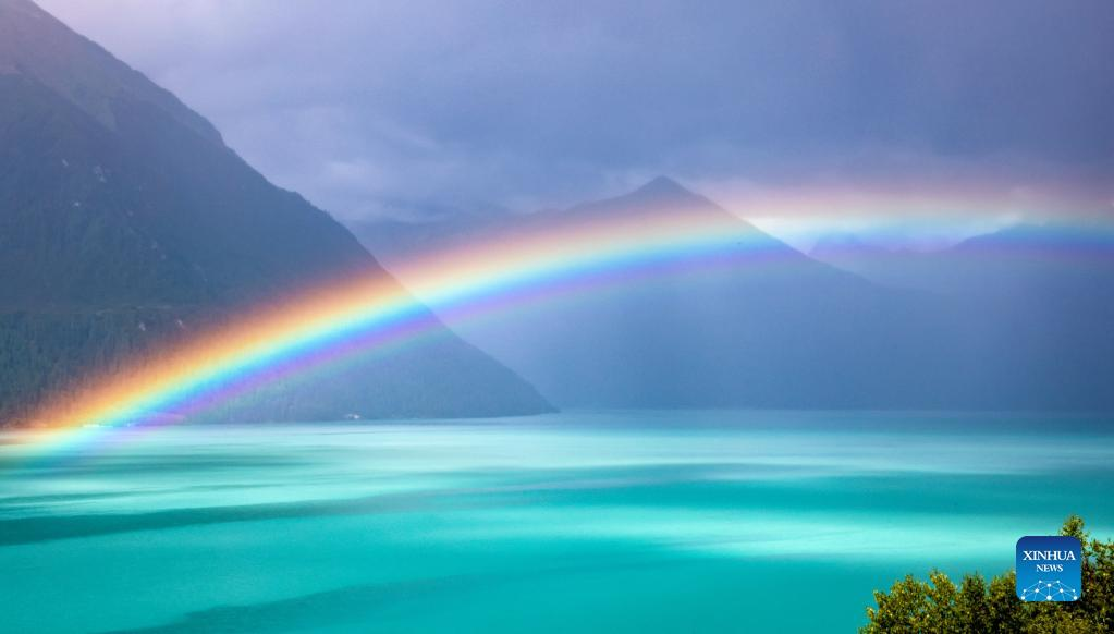 A rainbow appears in the sky over the Basum Lake in the city of Nyingchi, southwest China's Tibet Autonomous Region, Aug. 29, 2022. (Xinhua/Jiang Fan)