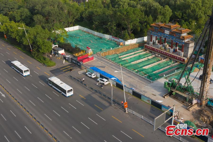 Aerial phone shows the relocated archway of Yingze Park in Taiyuan, Shanxi Province, Aug. 30, 2022. (Photo: China News Service)