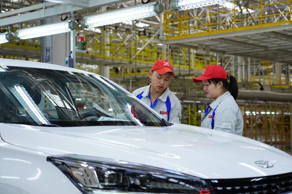 Quality inspectors check a new-energy vehicle in an automobile manufacturing workshop in Yibin, southwest China's Sichuan Province, July 20, 2022. (Xinhua/Liu Qiong)