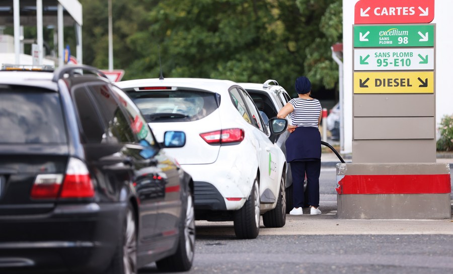 A woman fills the tank of her car at a gas station near Paris, France, Aug. 18, 2022. (Xinhua/Gao Jing)