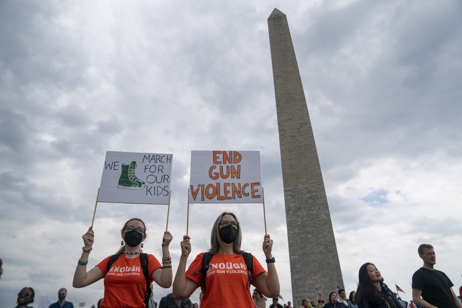 People gather during a rally decrying rising gun violence while urging politicians to take action in Washington, D.C., the United States, June 11, 2022. (Xinhua/Liu Jie)