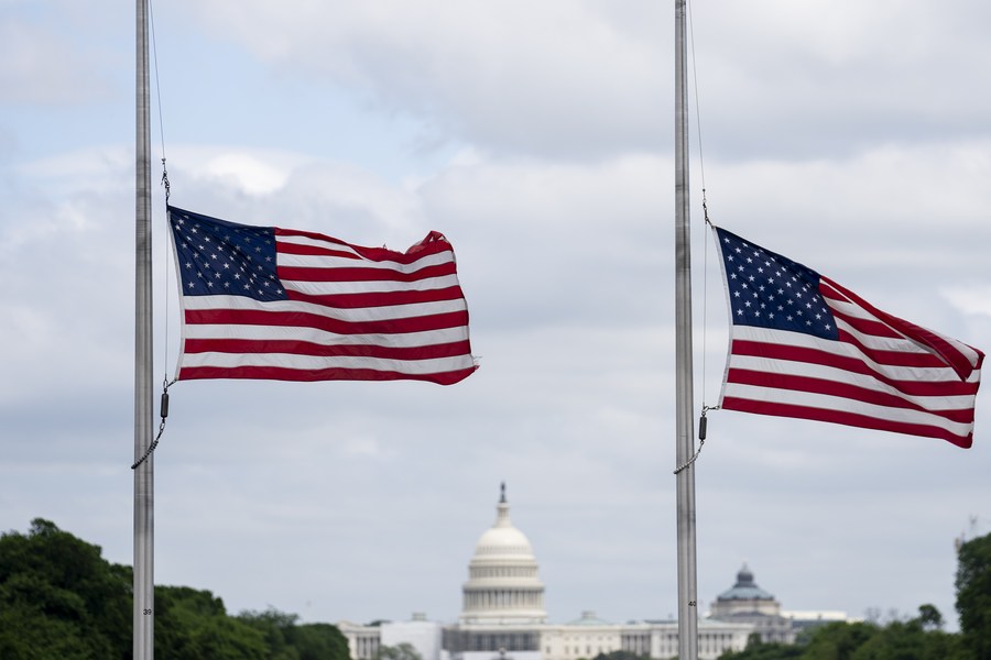 U.S. national flags fly at half-staff at the Washington Monument to mourn 1 million American lives lost to COVID-19 in Washington, D.C., the United States, on May 12, 2022. (Xinhua/Liu Jie)