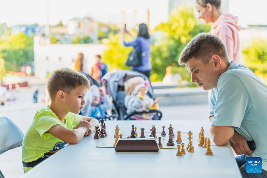A girl plays chess at a chess tent in Vladivostok, Russia, on Aug. 31, 2022. A chess tent was set up on a street in Vladivostok to promote chess culture. Chess fans can play for free and get guidance from professional tutors. (Photo by Guo Feizhou/Xinhua)