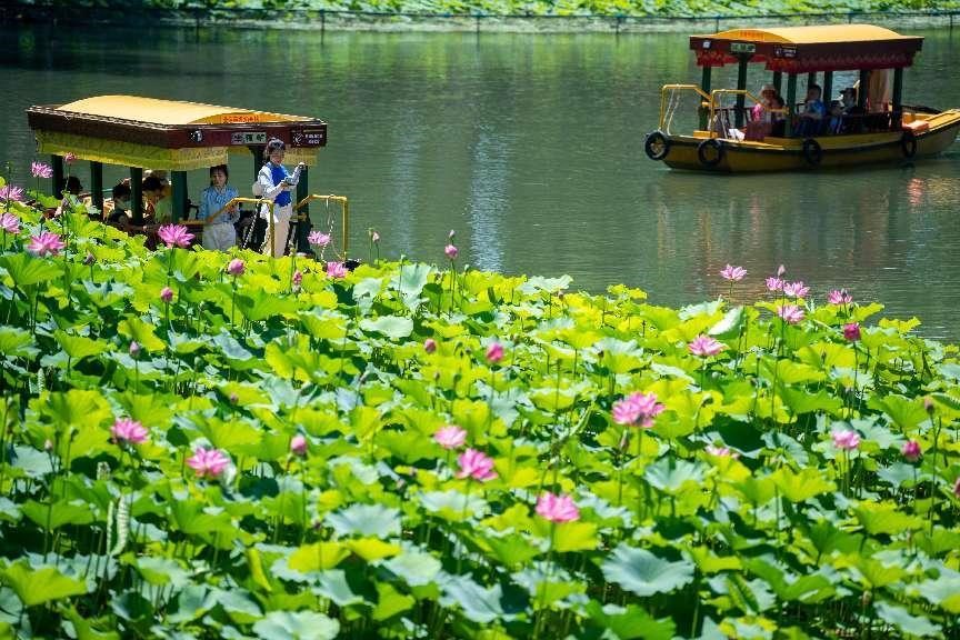 Visitors take boats in the Beihai Park of Beijing, July 7, 2022. (People's Daily Online/Weng Qiyu)