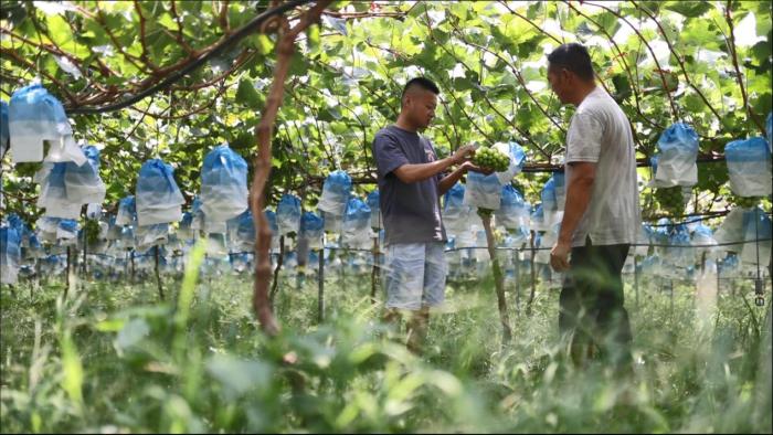 Liu Xiaosong is a major grower of Shine Muscat grapes in Shanzui village, Youjun township of Xichang city. Once an apple grower, Liu began to grow Shine Muscat grapes three years ago after building greenhouses covering 25 mu (about 1.7 hectares) of land for the grape variety and introducing an automatic irrigation system to improve production efficiency. He increased the planting area for the grape variety by 6 mu this year. After planting Shine Muscat grapes, Liu's income has increased by severalfold.