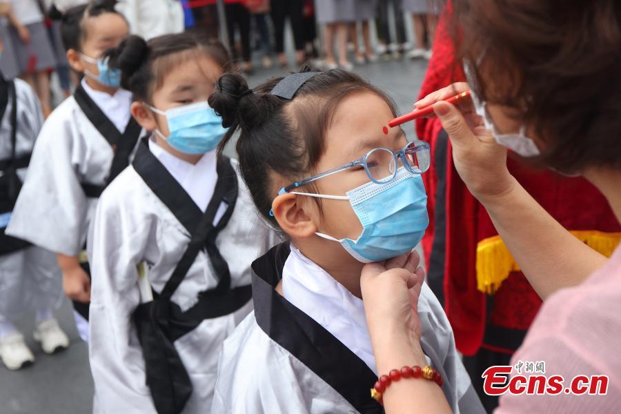 A teacher places a cinnabar mark on the forehead of a first-grade pupil during the first writing ceremony of a new semester at Fuzimiao, or the Confucius Temple in Nanjing, east Chinas Jiangsu Province, Aug. 31, 2022. Students across China embraced their new semester on Thursday. (Photo: China News Service/Yang Bo)