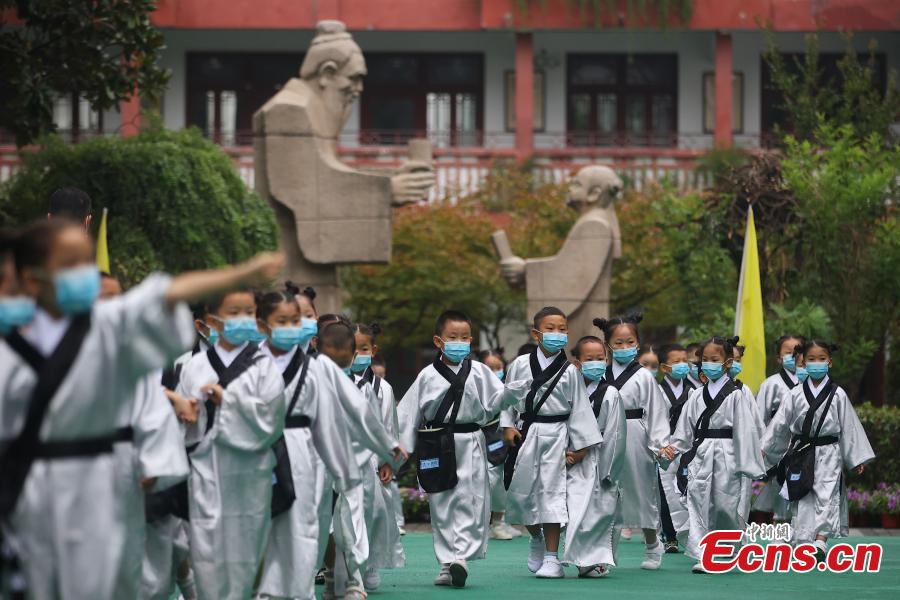 First-grade pupils wearing traditional Chinese uniforms attend the first writing ceremony of a new semester at Fuzimiao, or the Confucius Temple in Nanjing, east Chinas Jiangsu Province, Aug. 31, 2022. (Photo: China News Service/Yang Bo)