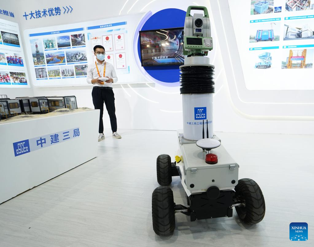 A staff member demonstrates a high-precision measuring robot for road engineering at the 2022 China International Fair for Trade in Services (CIFTIS) in Beijing, capital of China, Sept. 1, 2022. The CIFTIS is held in Beijing from Aug. 31 to Sept. 5. (Xinhua/Jin Haoyuan)