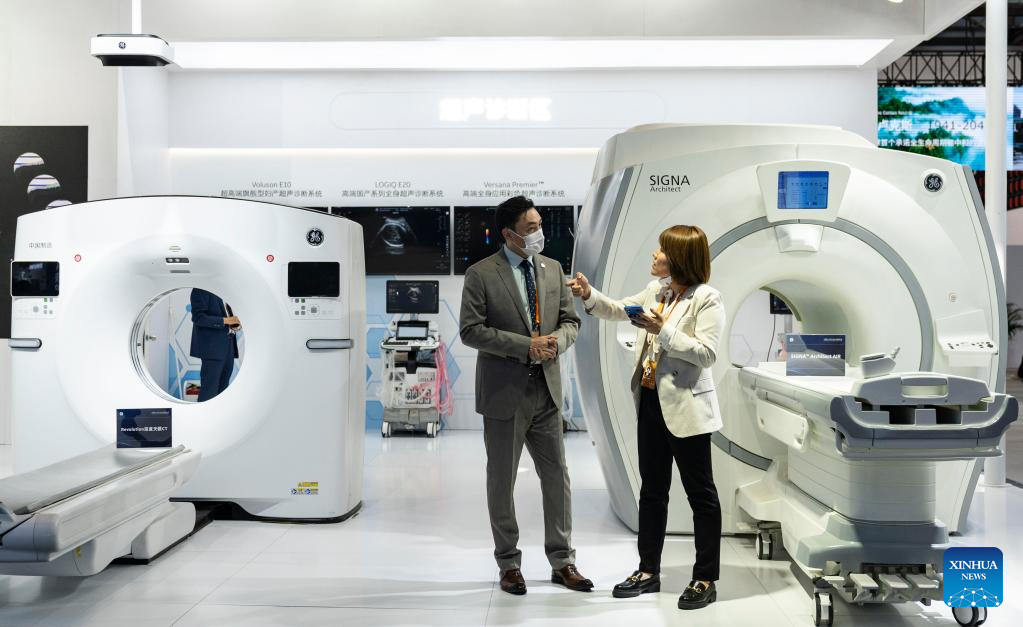 Staff members talk beside medical diagnostic devices displayed at the 2022 China International Fair for Trade in Services (CIFTIS) in Beijing, capital of China, Sept. 1, 2022. The CIFTIS is held in Beijing from Aug. 31 to Sept. 5. (Xinhua/Cai Yang)