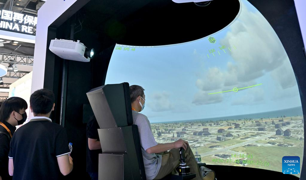 A visitor tries a smart VR driver training device displayed at the 2022 China International Fair for Trade in Services (CIFTIS) in Beijing, capital of China, Sept. 1, 2022. The CIFTIS is held in Beijing from Aug. 31 to Sept. 5. (Xinhua/Zhang Chenlin)