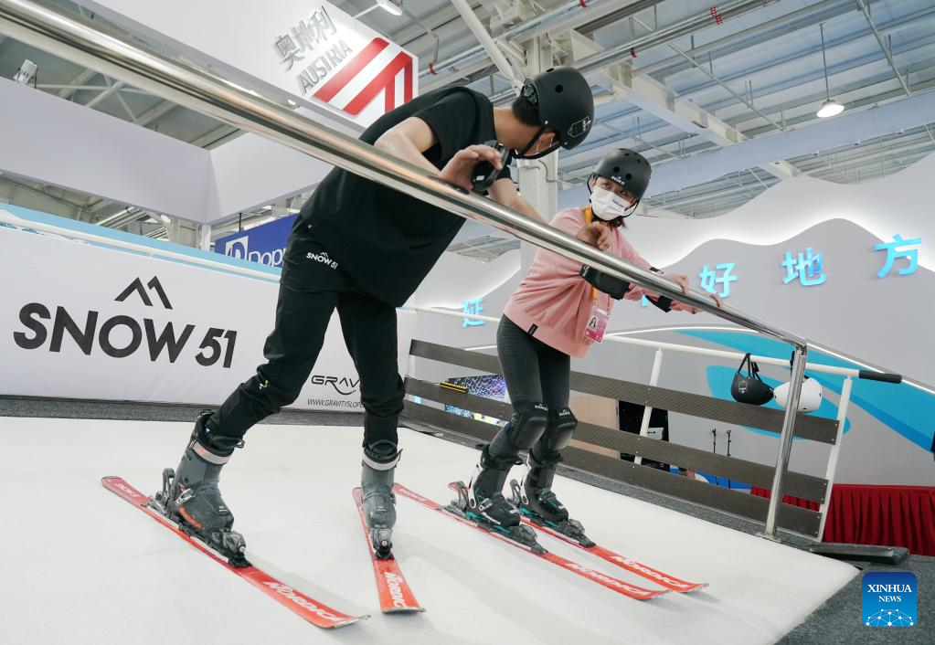 A reporter (R) tries a virtual skiing device displayed at the 2022 China International Fair for Trade in Services (CIFTIS) in Beijing, capital of China, Sept. 1, 2022. The CIFTIS is held in Beijing from Aug. 31 to Sept. 5. (Xinhua/Zhang Chenlin)