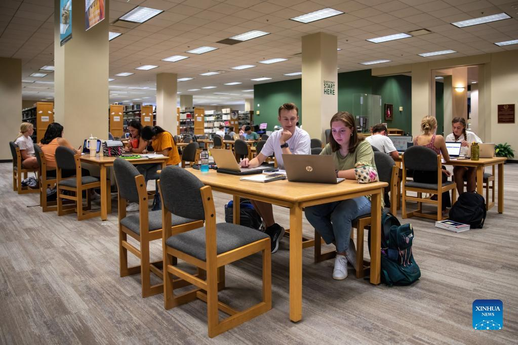 Students are seen at a library of Baylor University in Waco, Texas, the United States, on Aug. 28, 2022. (Photo by Xin Jin/Xinhua)