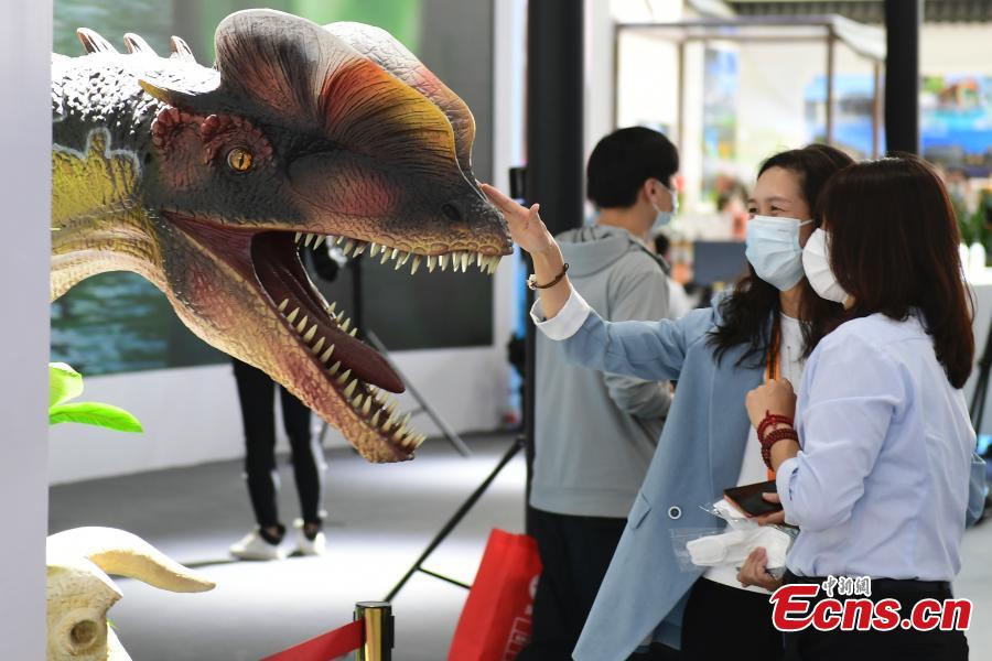 A visitor touches an electric dinosaur model at the Shougang Park in Beijing, Sept. 1, 2022. (Photo: China News Service/Tian Yuhao)