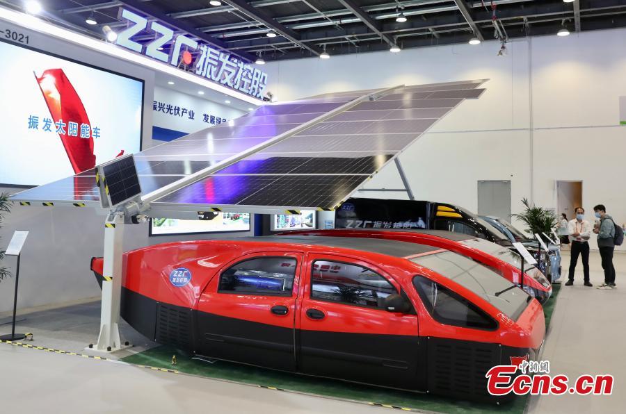 Photo taken on Sept. 1, 2022 shows solar-powered racing cars at the 2022 China International Fair for Trade in Services (CIFTIS) in Beijing, Sept. 1, 2022. (Photo: China News Service/Yi Haifei)