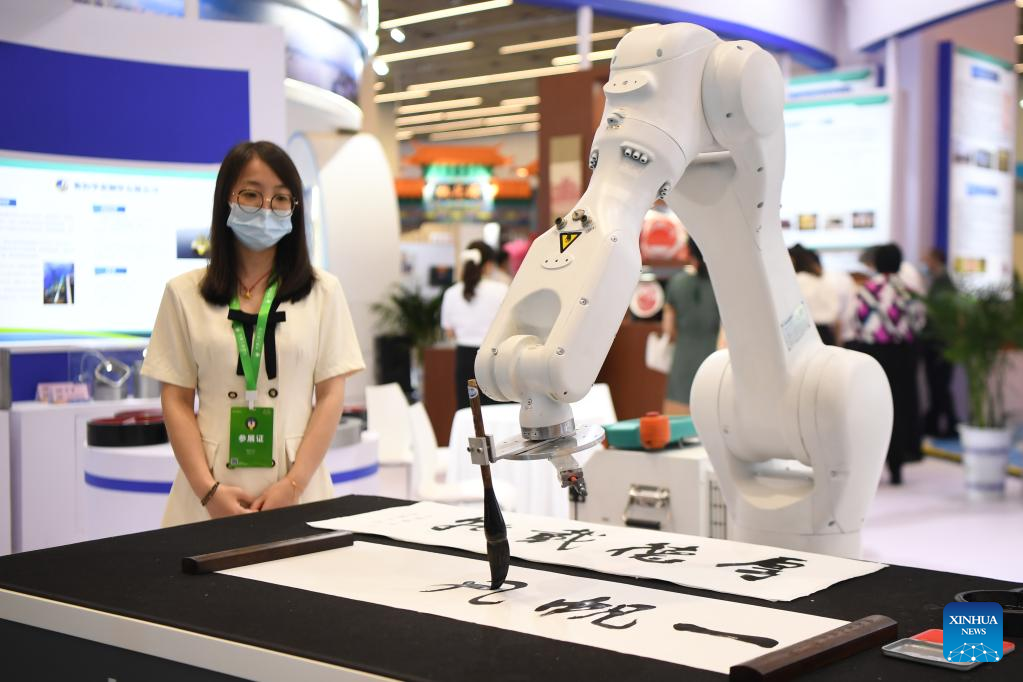 A mechanical arm performs calligraphy at an achievement exhibition during the National Great Craftsman Forum in Changsha, central China's Hunan Province, Sept. 2, 2022. The first edition of the forum kicked off here on Friday, providing a platform for craftsmen to share experiences and learn from each other. (Xinhua/Xue Yuge)