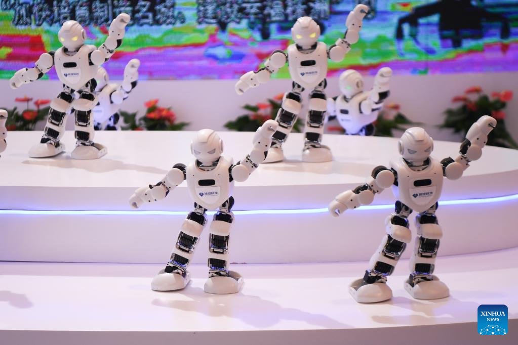 Dancing robots perform at an achievement exhibition during the National Great Craftsman Forum in Changsha, central China's Hunan Province, Sept. 2, 2022. The first edition of the forum kicked off here on Friday, providing a platform for craftsmen to share experiences and learn from each other. (Xinhua/Xue Yuge)