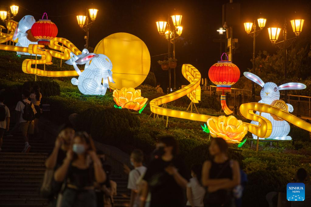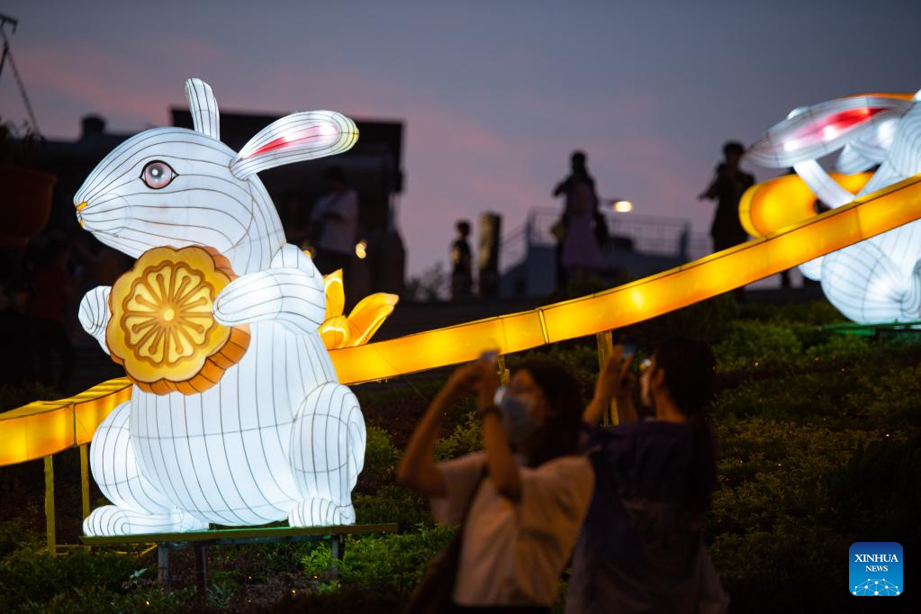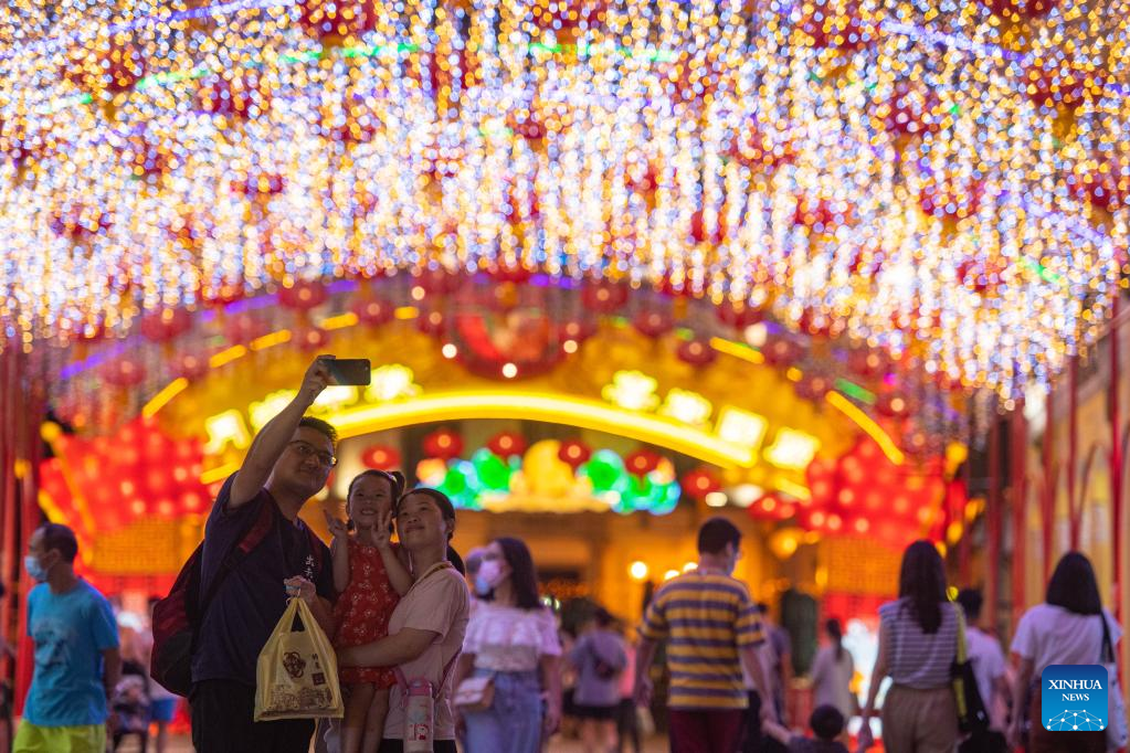People take selfies with illumination installations at the Largo Do Senado in Macao, south China, Sept. 3, 2022. Landmarks including the Ruins of the St. Paul's and the Largo Do Senado in Macao are decorated with illuminations to celebrate the upcoming Mid-Autumn Festival. (Xinhua/Cheong Kam Ka)