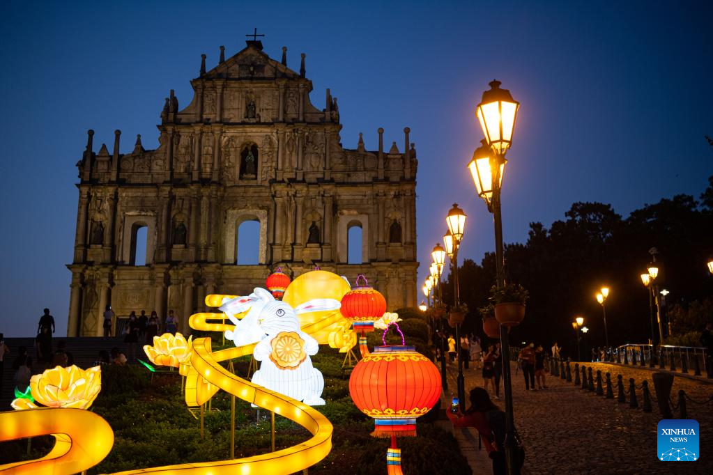 Illumination installations are seen in front of the Ruins of the St. Paul's in Macao, south China, Sept. 3, 2022. Landmarks including the Ruins of the St. Paul's and the Largo Do Senado in Macao are decorated with illuminations to celebrate the upcoming Mid-Autumn Festival. (Xinhua/Cheong Kam Ka)